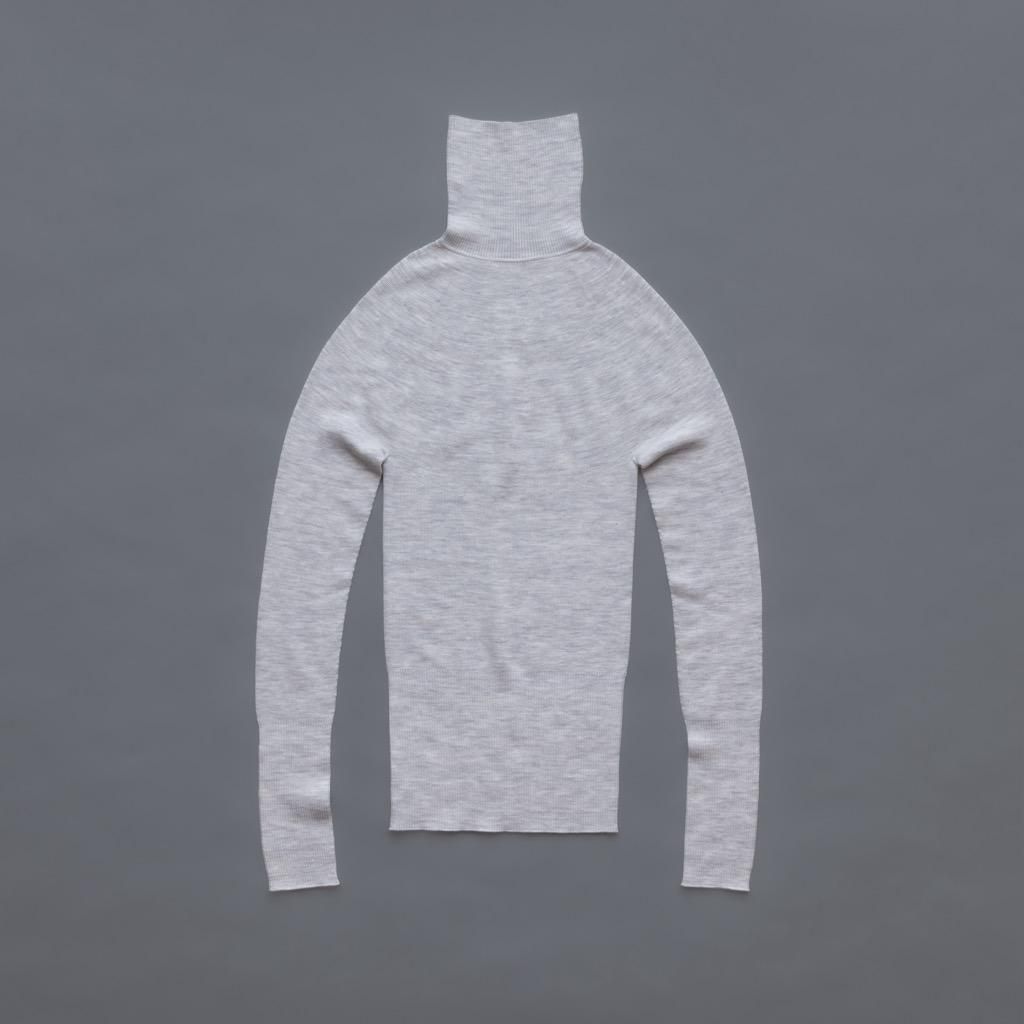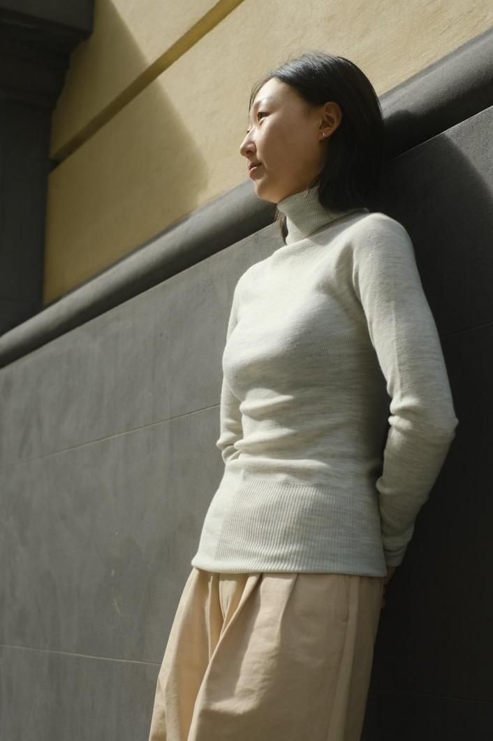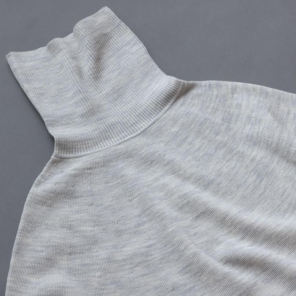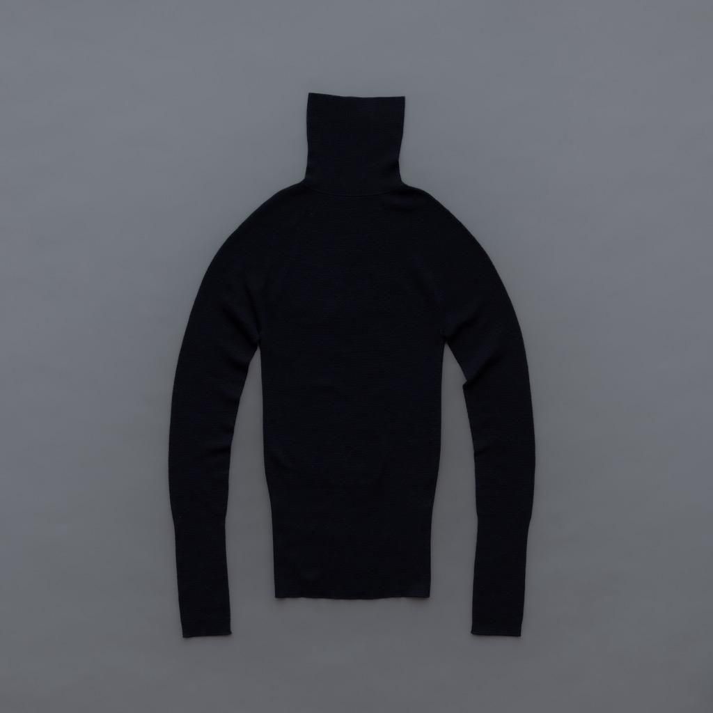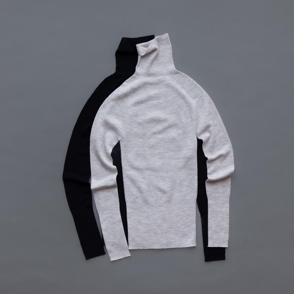 胸から首元に向かう求心線は、ホールガーメントならではの編み目。ミニマムで上質な美しさ醸し出しています。袖口や裾には少し長めのリブ編みを組合せて手首やお腹周りを優しくホールド。1枚のタートルネックの中にある豊かな編みの表情をお楽しみください