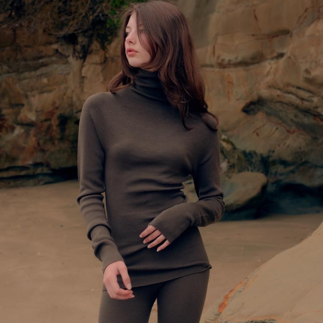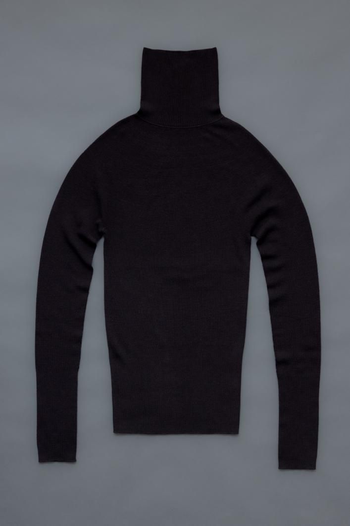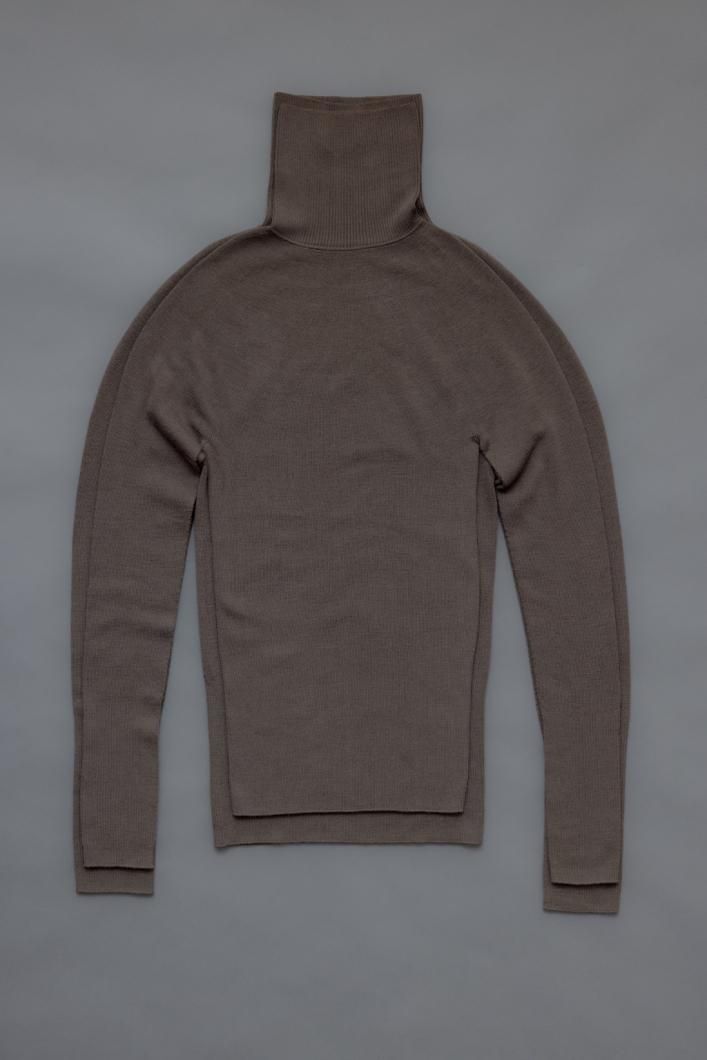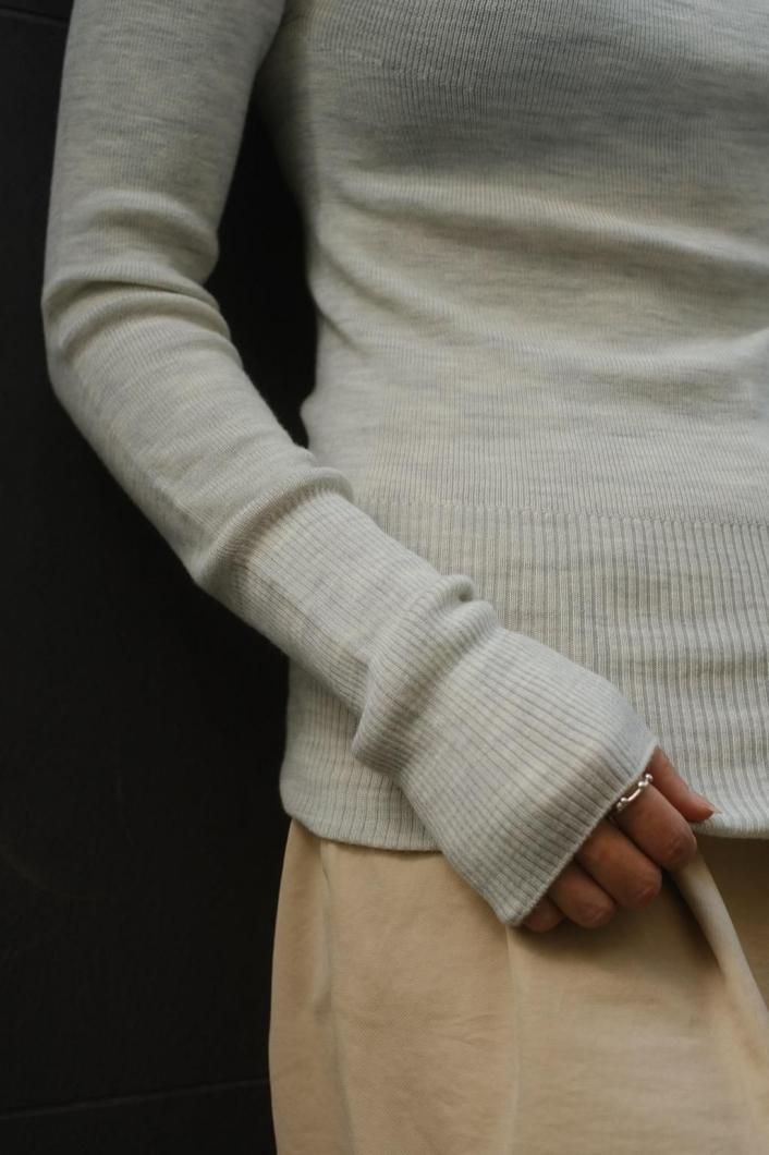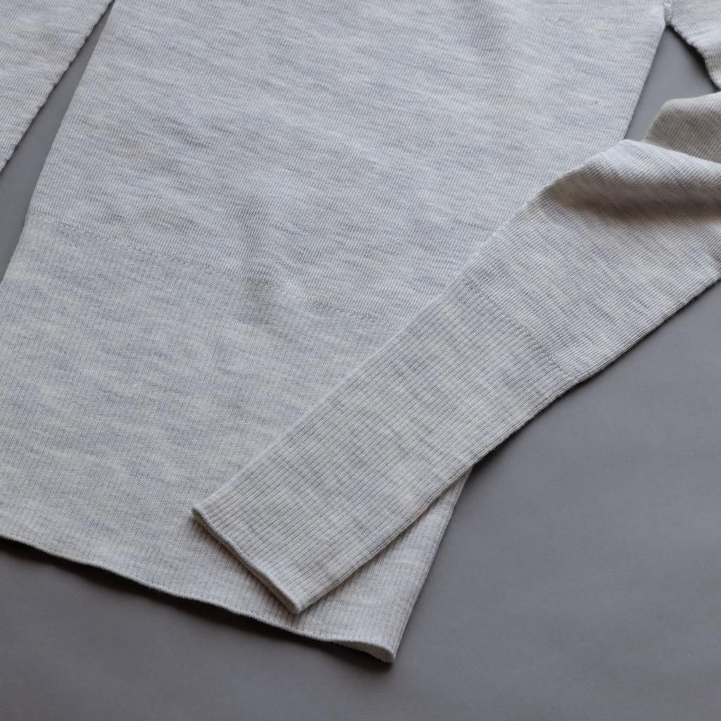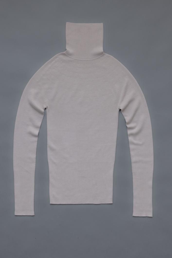 胸から首元に向かう求心線は、ホールガーメントならではの編み目。ミニマムで上質な美しさ醸し出しています。袖口や裾には少し長めのリブ編みを組合せて手首やお腹周りを優しくホールド。1枚のタートルネックの中にある豊かな編みの表情をお楽しみください