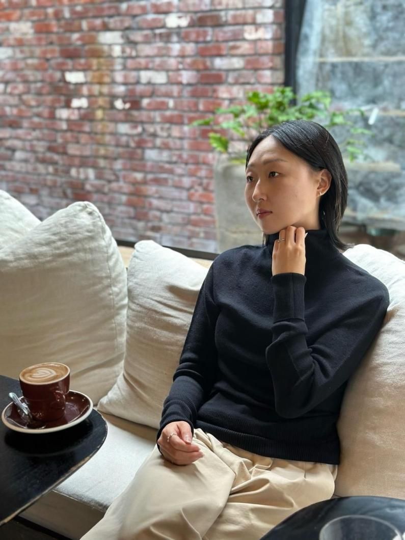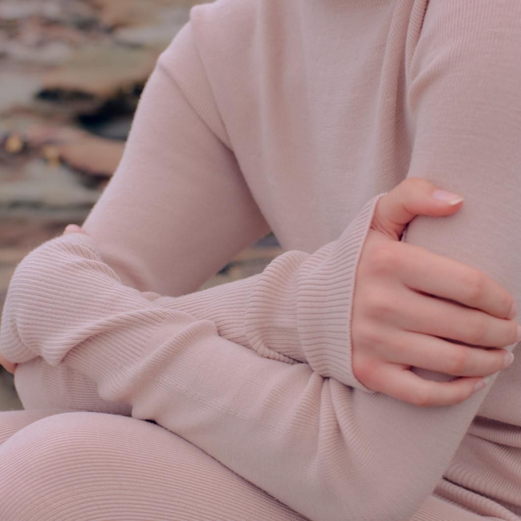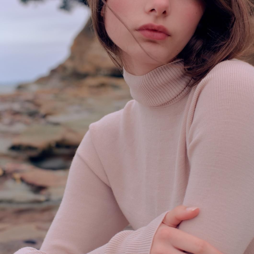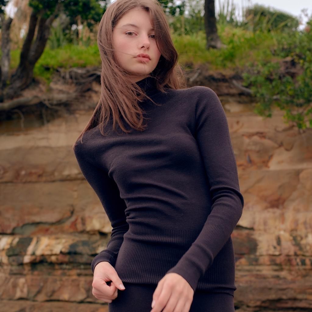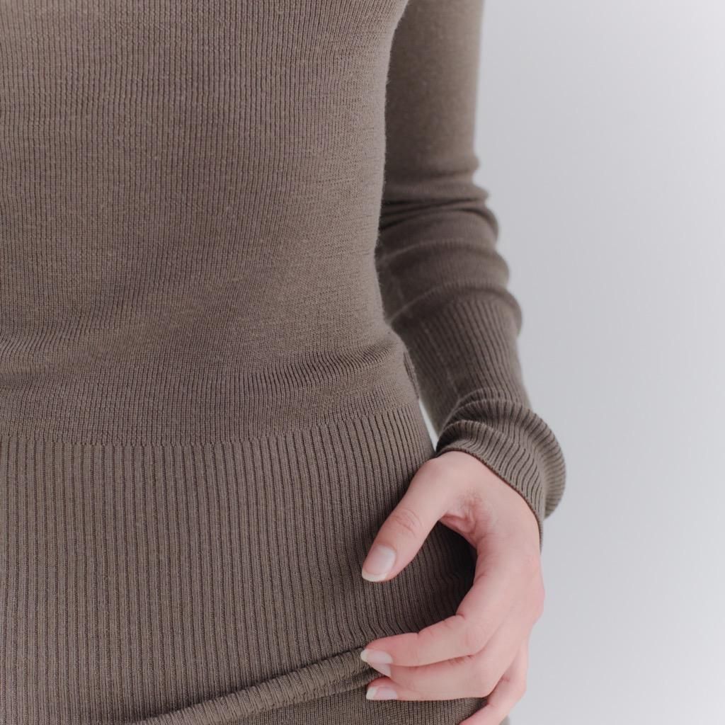 胸から首元に向かう求心線は、ホールガーメントならではの編み目。ミニマムで上質な美しさ醸し出しています。袖口や裾には少し長めのリブ編みを組合せて手首やお腹周りを優しくホールド。1枚のタートルネックの中にある豊かな編みの表情をお楽しみください