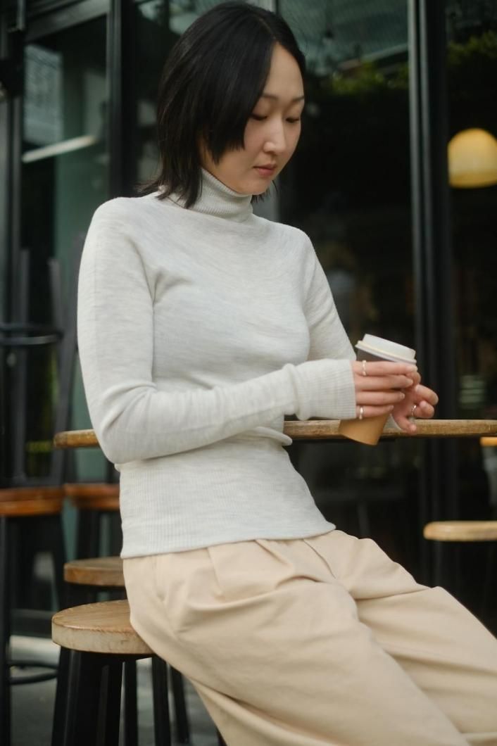 日本発の「ホールガーメント技術」。一針も縫う ことなく立体的に成型する技術を活かし、着心地 のよさとシルエットの美しさを両立させた、あっ たかプレミアムタートルネック。極細17.5ミクロンのスーパーエク ストラファインメリノ100%使用。